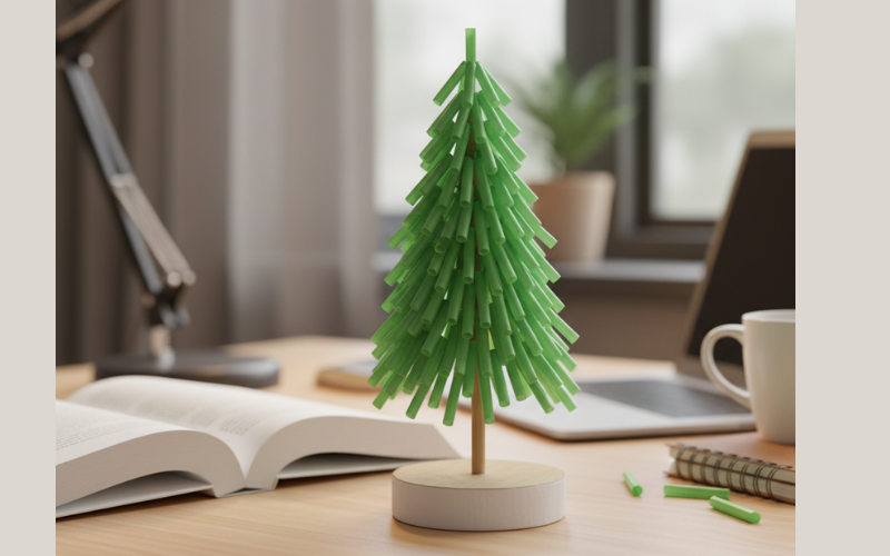 - Cây thông mini để bàn: Sử dụng ống hút ngắn và đế tròn nhỏ, phù hợp cho bàn học hay bàn cà phê.