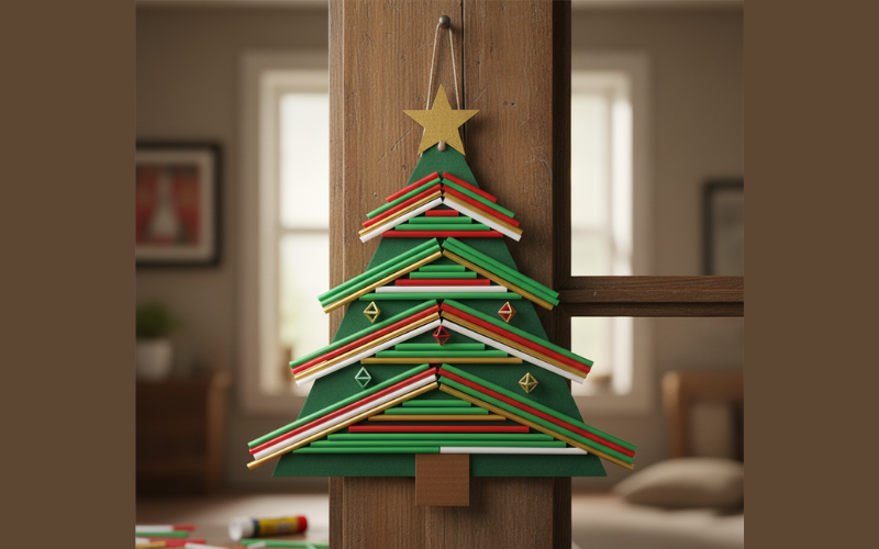 - Cây thông treo tường: Dùng ống hút dán lên giấy cứng thành hình cây thông phẳng, treo ở cửa hoặc tường.