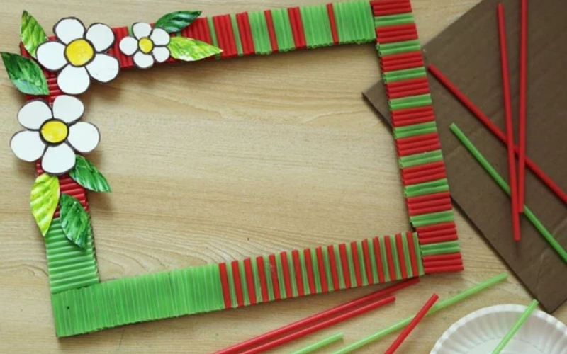Bước 4: Dán ống hút lên viền bìa để tạo khung. Có thể tạo hình zigzag, chéo, hoặc sắp xếp theo màu sắc để thêm phần bắt mắt.